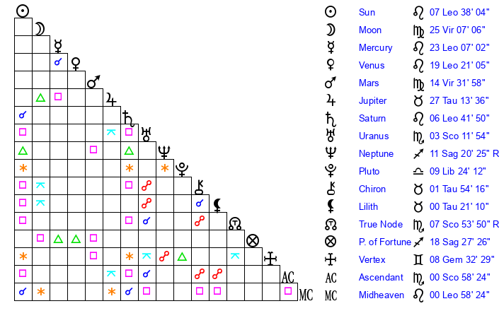 | Mercury | 23 Leo 7 | 9 Leo 57 | 3 Libra 41 |