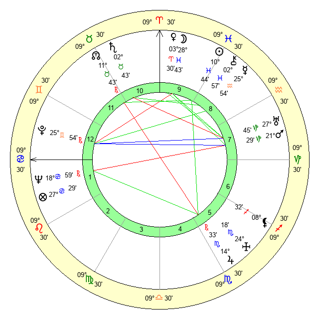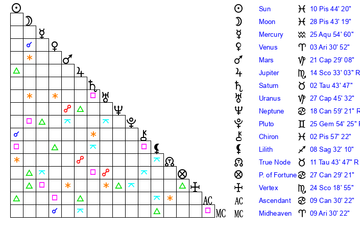 | Sun | 10 Pisces 44 | 12 Pisces 6 | 1 Cancer 47 |