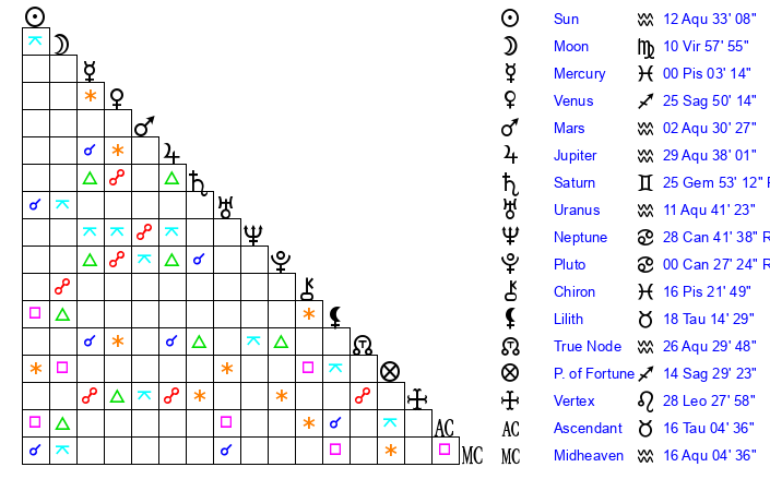 | Sun | 12 Aquarius 32 | 13 Aquarius 51 | 1 Gemini 13 |