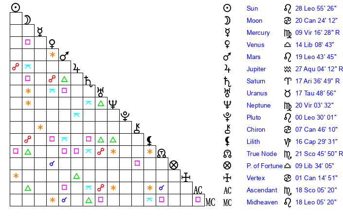 | Pluto | 0 Leo 30 | 1 Aquarius 56 | 1 Leo 27 |