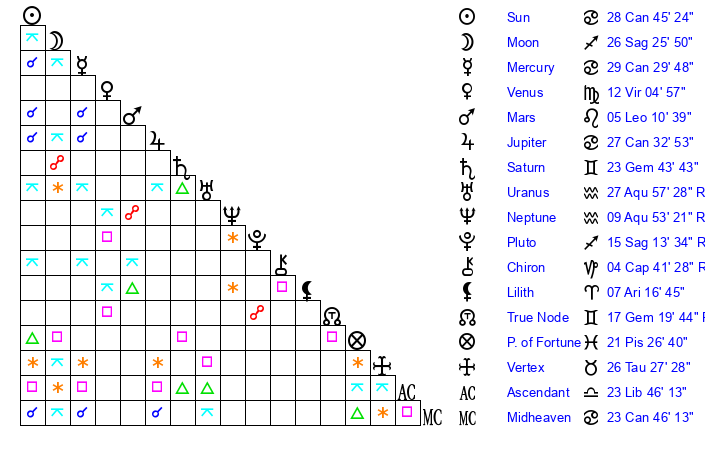 | Moon | 26 Sagittarius 19 | 18 Gemini 17 | 28 Libra 9 |