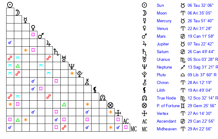 Sun | 6 Taurus 32 | 6 Taurus 40 | 23 Gemini 42 |