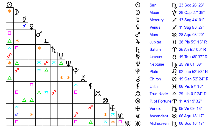 | Sun | 23 Scorpio 26 | 24 Scorpio 35 | 20 Aquarius 49 |