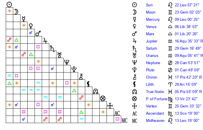 | Sun | 22 Leo 57 | 24 Leo 5 | 12 Sagittarius 44 |