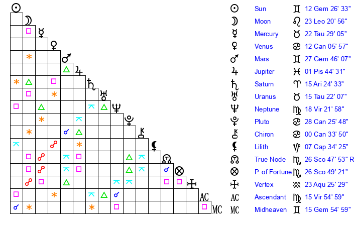 | Sun | 12 Gemini 26 | 13 Gemini 22 | 5 Virgo 40 |