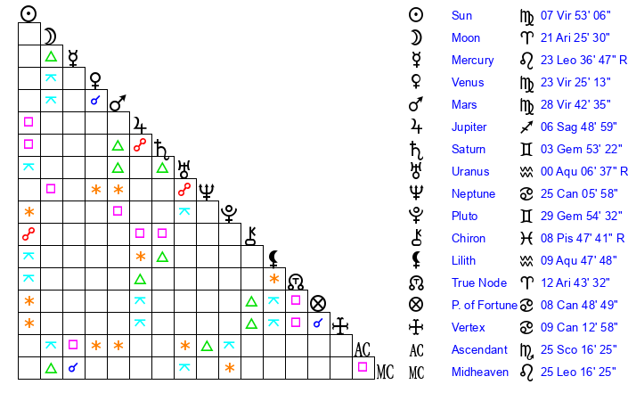 | Venus | 23 Virgo 26 | 7 Leo 12 | 11 Aquarius 42 |