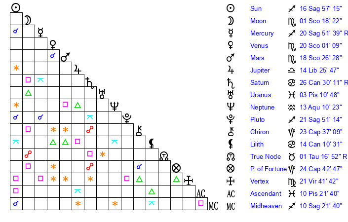 Sun | 16 Sagittarius 57 | 17 Sagittarius 6 | 7 Capricorn 19 |