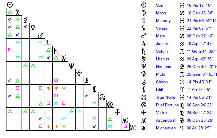 | Sun | 16 Pisces 17 | 17 Pisces 22 | 4 Cancer 13 |