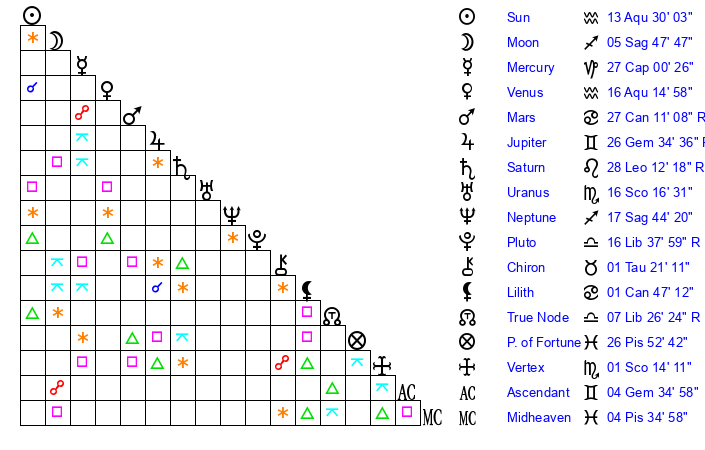 | Venus | 16 Aquarius 15 | 28 Pisces 46 | 14 Aries 57 |