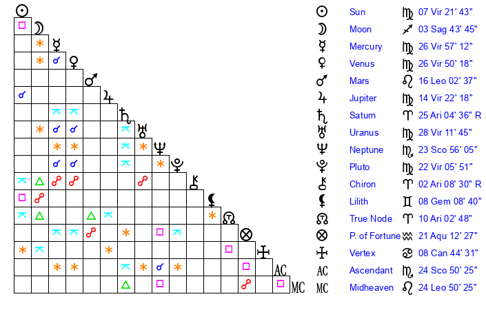 Mercury | 26 Virgo 58 | 24 Leo 39 | 16 Libra 7 |