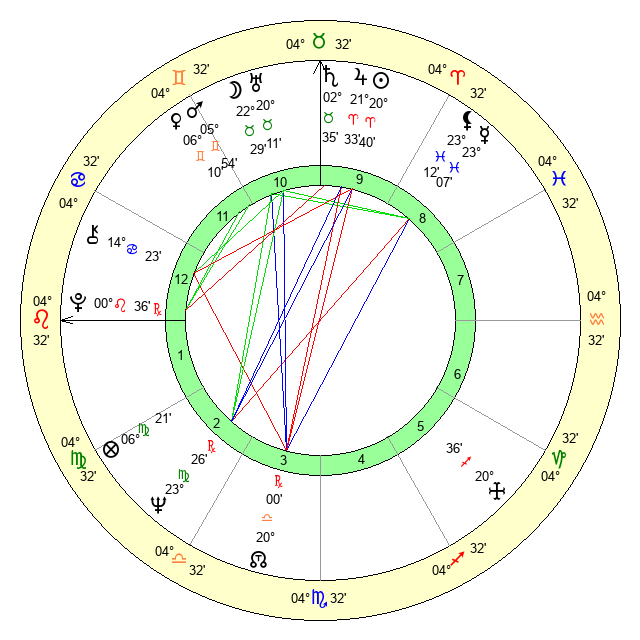 | Moon | 22 Taurus 34 | 25 Virgo 48 | 2 Cancer 44 |
