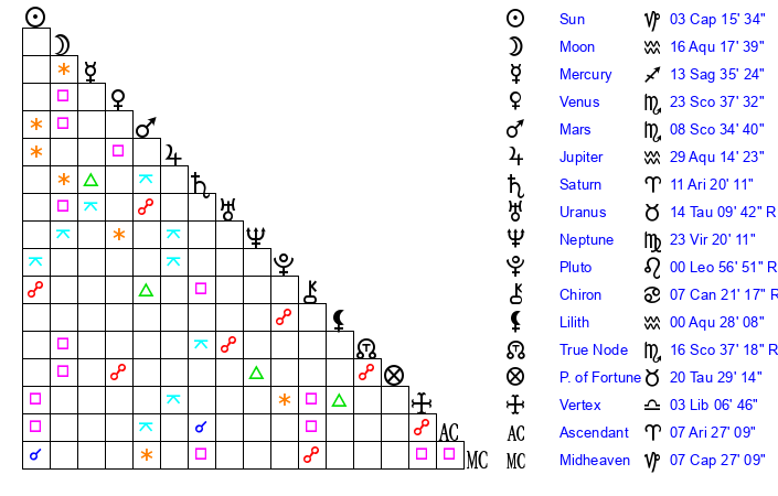 | Venus | 23 Scorpio 37 | 1 Capricorn 17 | 19 Aquarius 50 |