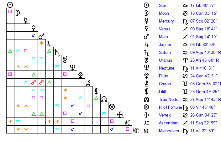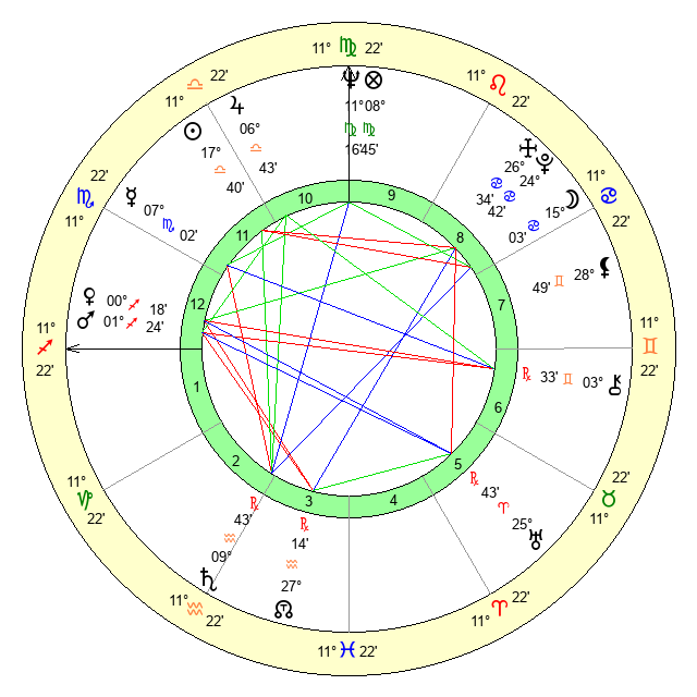 | Neptune | 11 Virgo 17 | 0 Aries 15 | 12 Virgo 10 |