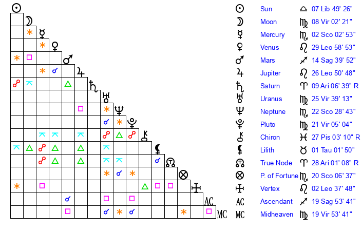 | Moon | 7 Virgo 58 | 28 Capricorn 27 | 24 Libra 26 |