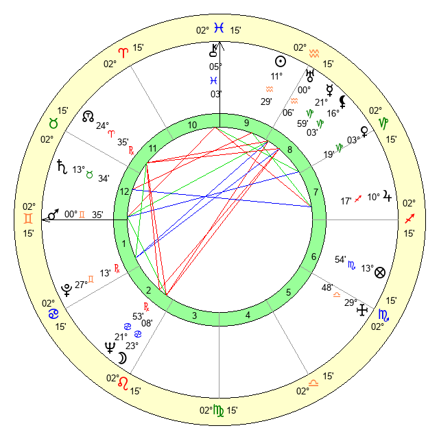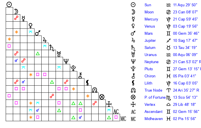 | Sun | 11 Aquarius 29 | 13 Aquarius 5 | 3 Gemini 7 |