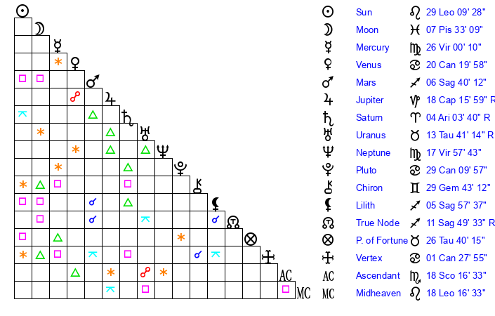 | Moon | 7 Pisces 35 | 23 Leo 4 | 1 Gemini 0 |