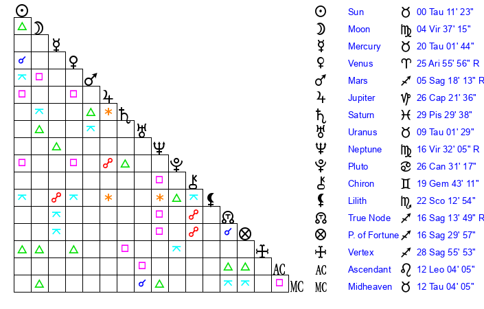 | Sun | 0 Taurus 11 | 0 Taurus 52 | 24 Cancer 40 |