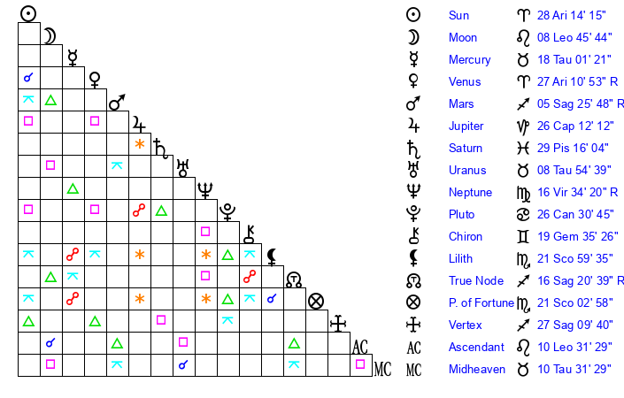 | Sun | 28 Aries 14 | 28 Aries 54 | 22 Cancer 45 |