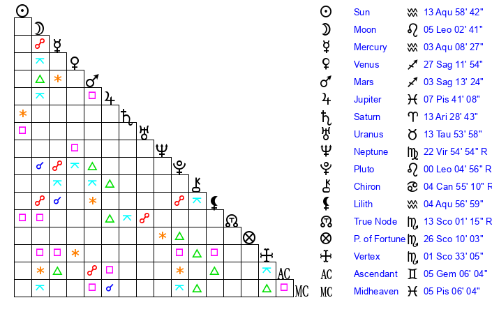| Jupiter | 7 Pisces 38 | 11 Gemini 16 | 27 Pisces 45 |