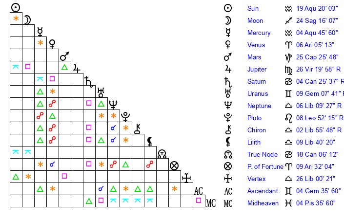 Mercury | 4 Aquarius 47 | 19 Aquarius 9 | 17 Aries 4 |