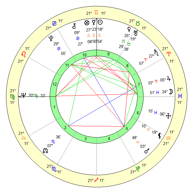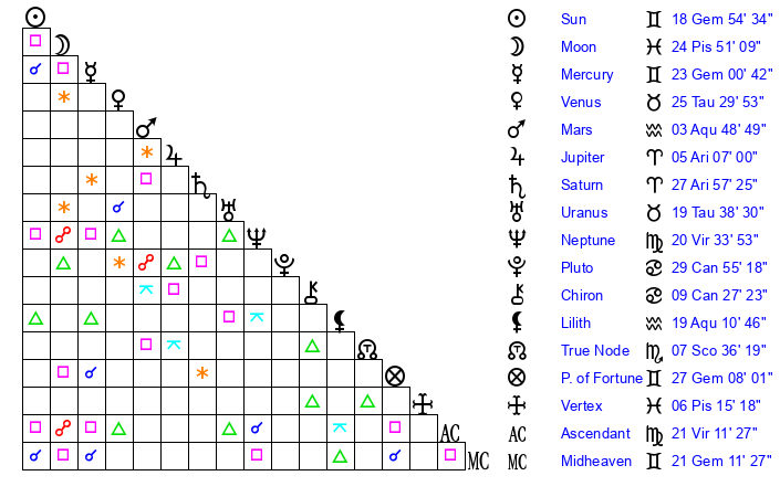 | Sun | 18 Gemini 54 | 20 Gemini 4 | 11 Virgo 15 |