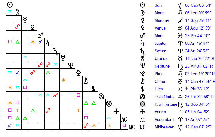 | Saturn | 24 Aries 34 | 25 Pisces 53 | 0 Taurus 32 |