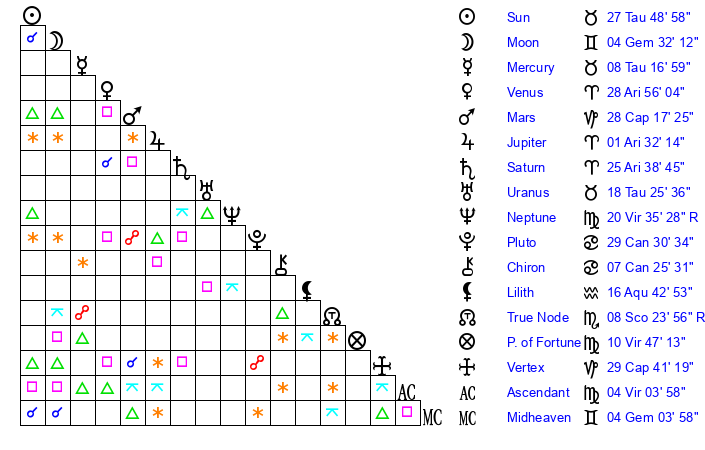 | Sun | 27 Taurus 48 | 28 Taurus 58 | 20 Leo 2 |