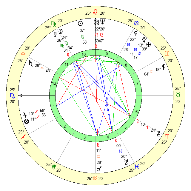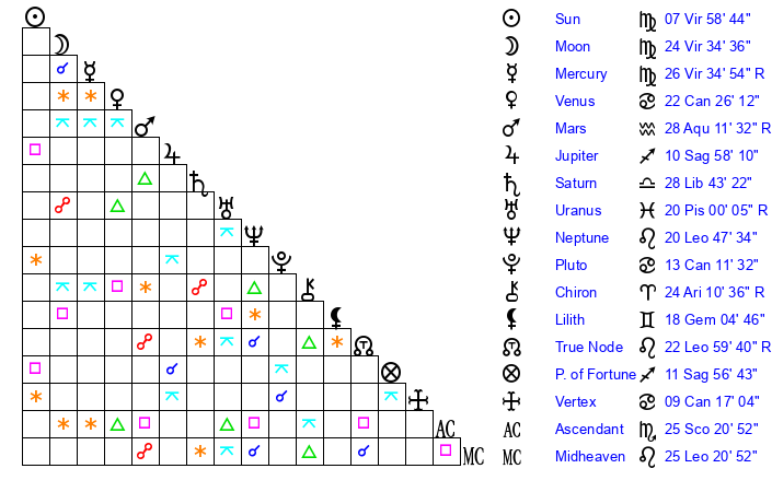 | Moon | 24 Virgo 40 | 13 Sagittarius 23 | 11 Gemini 59 |