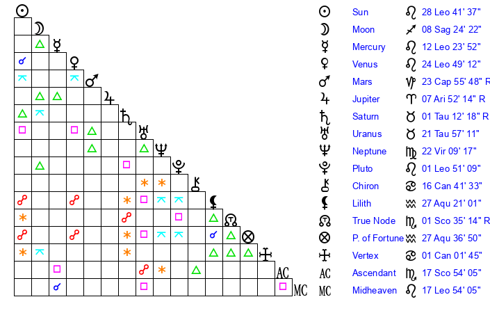 | Mercury | 12 Leo 23 | 11 Leo 50 | 13 Sagittarius 44 |