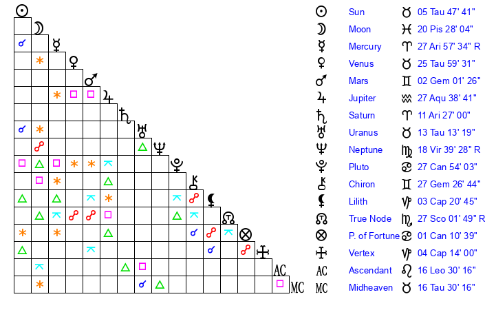 | Venus | 26 Taurus 0 | 27 Pisces 58 | 9 Virgo 45 |