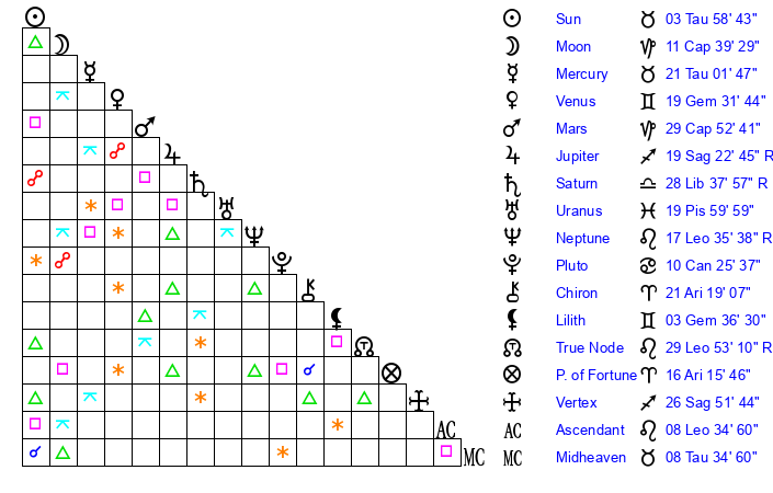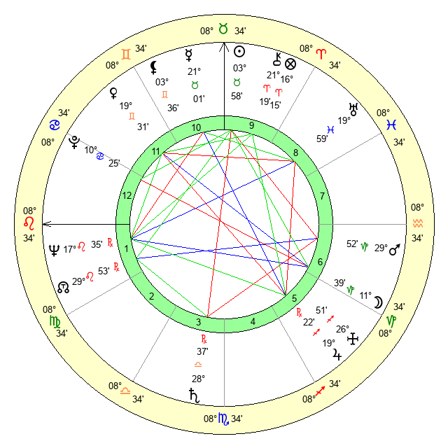 | Neptune | 17 Leo 35 | 0 Aries 53 | 19 Leo 45 |