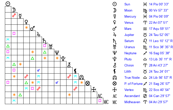 | Sun | 14 Pisces 0 | 14 Pisces 22 | 1 Taurus 28 |