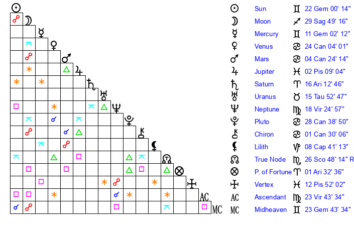 | Sun | 22 Gemini 0 | 22 Gemini 56 | 15 Virgo 22 |