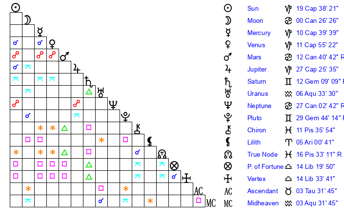 | Jupiter | 27 Capricorn 12 | 20 Cancer 4 | 19 Aquarius 37 |