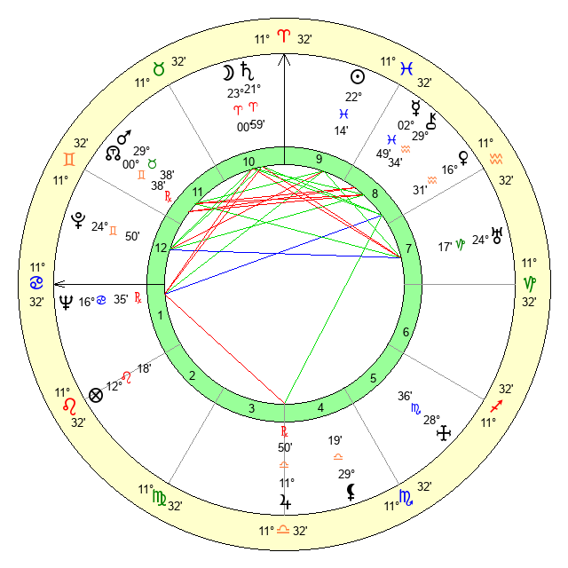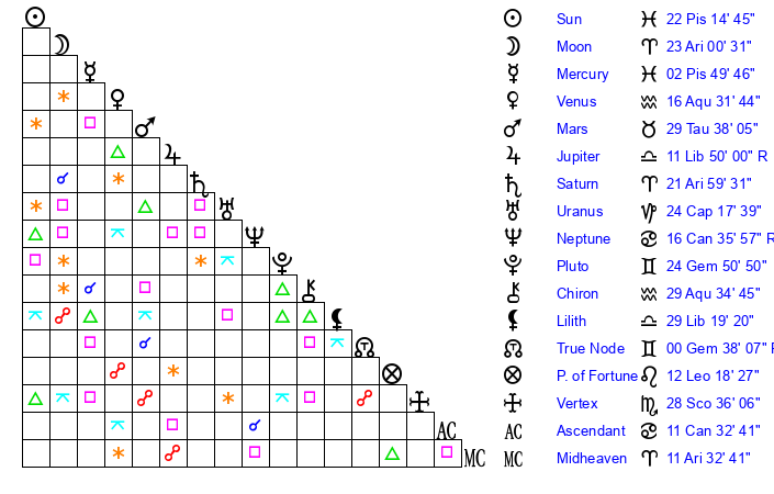 | Moon | 22 Aries 54 | 16 Virgo 46 | 11 Cancer 17 |