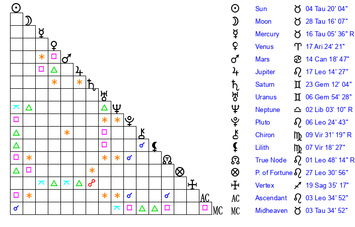 | Neptune | 4 Libra 15 | 27 Pisces 18 | 2 Libra 55 |