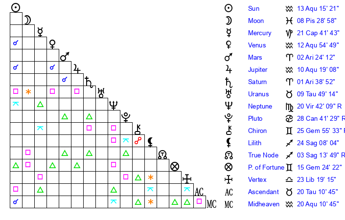 | Sun | 13 Aquarius 15 | 14 Aquarius 9 | 9 Taurus 43 |