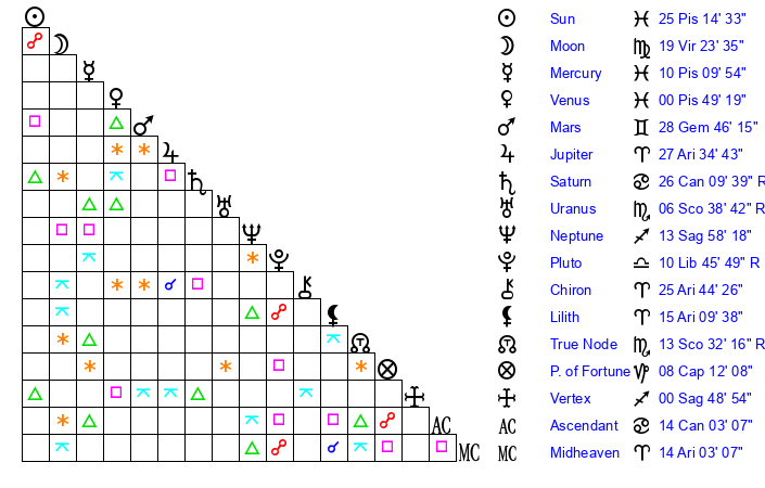 | Sun | 25 Pisces 14 | 25 Pisces 22 | 13 Taurus 22 |
