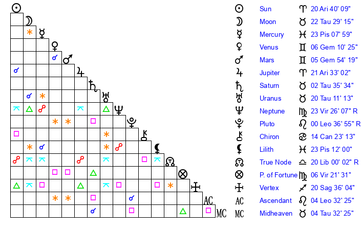| Sun | 20 Aries 40 | 21 Aries 4 | 12 Cancer 31 |