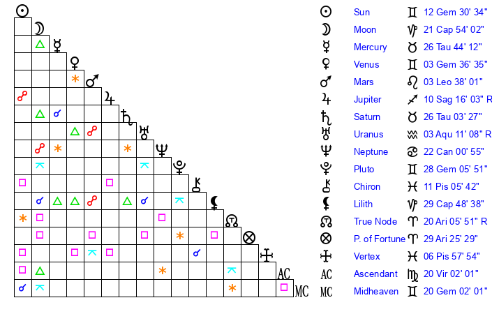 Sun | 12 Gemini 30 | 13 Gemini 9 | 1 Libra 3 |