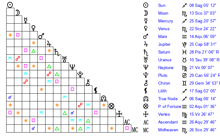 | Venus | 22 Scorpio 24 | 29 Scorpio 50 | 12 Pisces 56 |