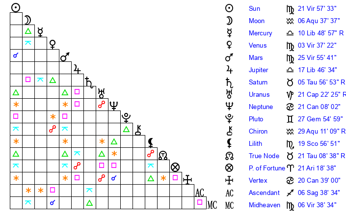 | Sun | 21 Virgo 57 | 23 Virgo 6 | 17 Capricorn 19 |