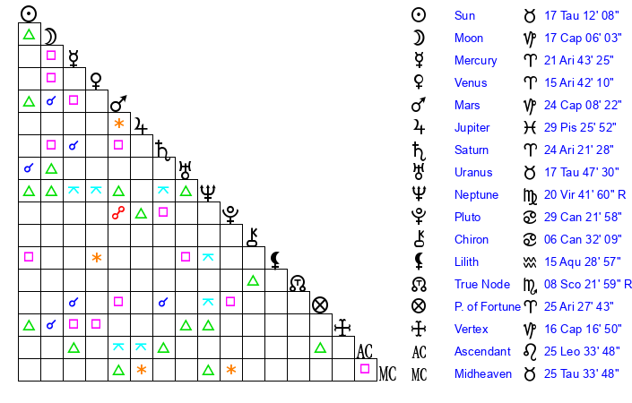 | Moon | 17 Capricorn 3 | 4 Libra 51 | 6 Pisces 5 |