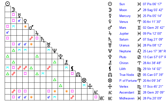 | Sun | 7 Pisces 7 | 8 Pisces 21 | 13 Gemini 4 |