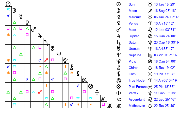 | Moon | 16 Sagittarius 10 | 16 Leo 8 | 13 Taurus 20 |