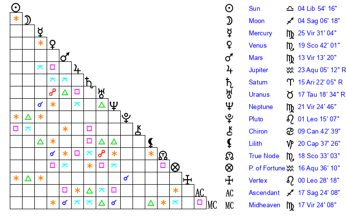 | Neptune | 21 Virgo 25 | 0 Aries 36 | 23 Virgo 20 |