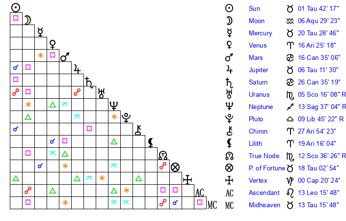 | Neptune | 13 Sagittarius 36 | 0 Aries 47 | 12 Sagittarius 24 |