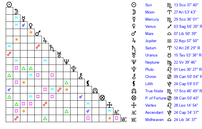 | Sun | 13 Scorpio 37 | 14 Scorpio 32 | 11 Aquarius 57 |