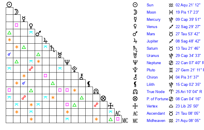 | Sun | 2 Aquarius 21 | 3 Aquarius 57 | 24 Taurus 28 |