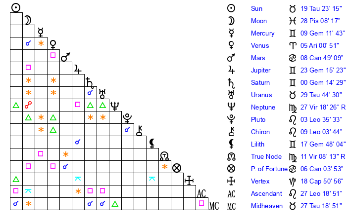 | Neptune | 27 Virgo 19 | 1 Aries 22 | 27 Virgo 52 |